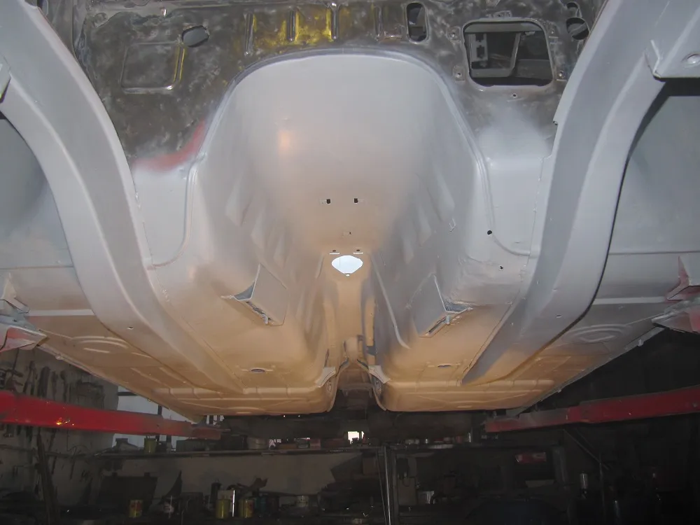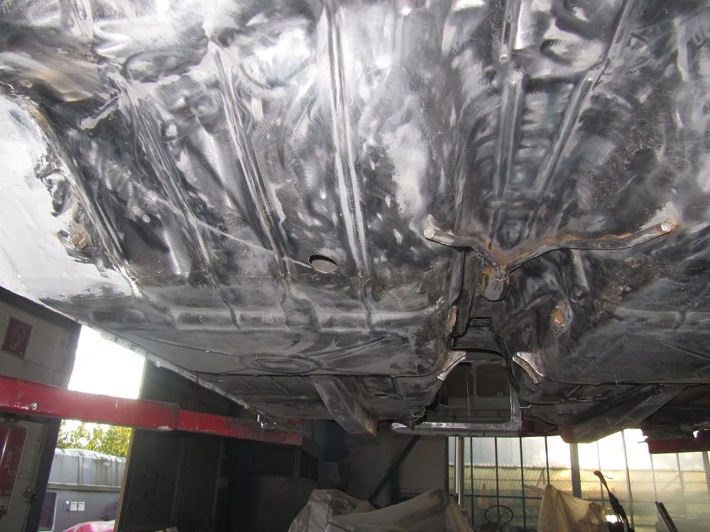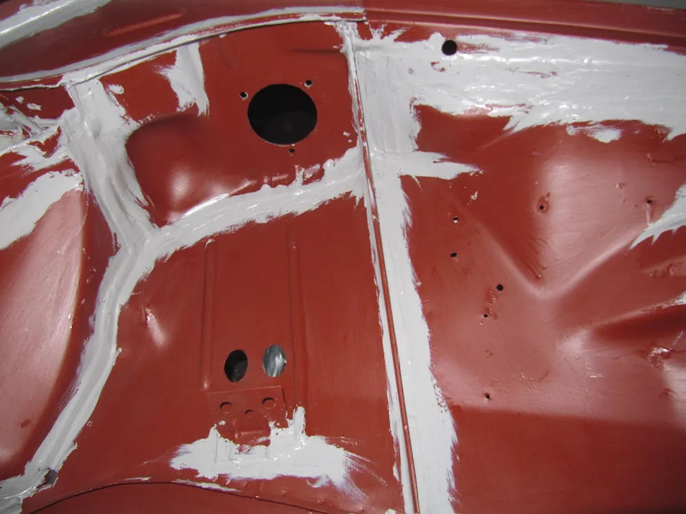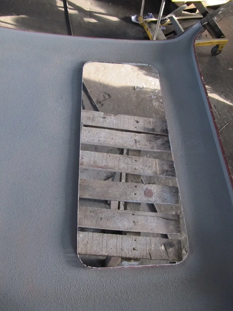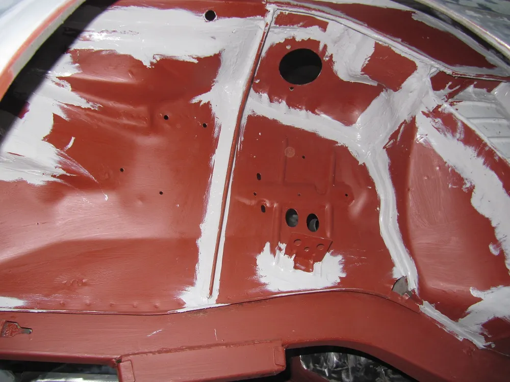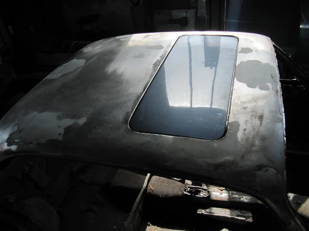 Aus einem der Schlachter hatte ich mit ein komplettes Dach ohne Schiebdach behalten. Davon habe ich dann die Dachhaut herunterpräpariert und innen wieder die 2fach Brantho-Kur angewendet.