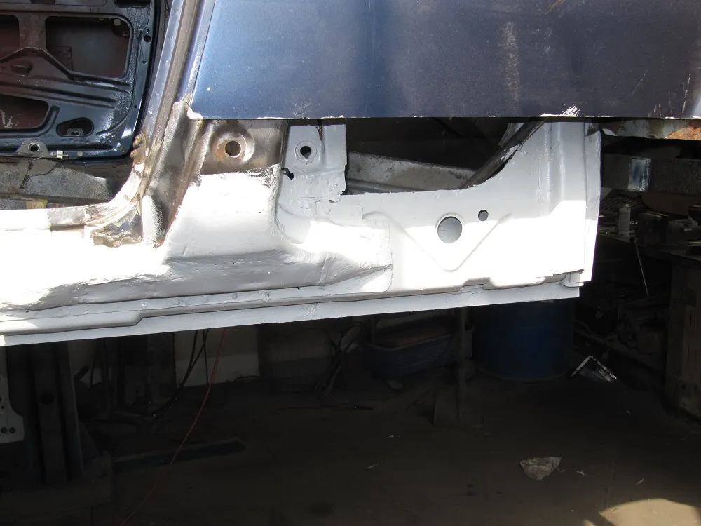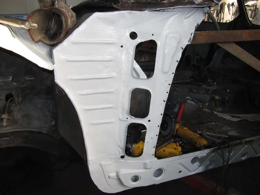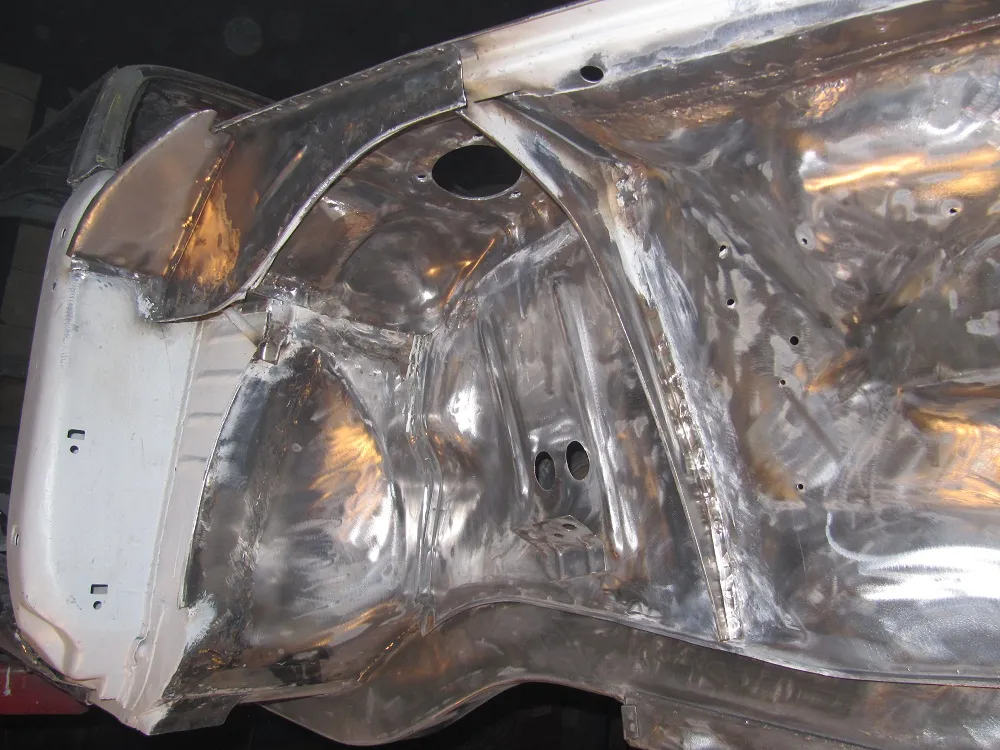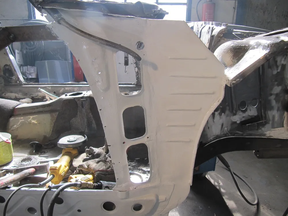Von EKKI habe ich die beiden hinteren Seitenteile bekommen, die er zusammen mit seinem E9 übernommen hatte. Das waren mMn auch schon ersetzte Teile und die linke Seite war mit Ausnahme einer Beule vor/über dem Radlauf in einem Superzustand. Das rechte hatte ein klein wenig mehr an Aufbereitung nötig und mußte am hintere Ende des Radlaufs geschweißt werden, hatte auch eine dicke Spachtelschicht auf einer Delle vor/über dem Radlauf, war aber auch gut zu retten. Auch die Teile bekamen 2fach Brantho Korrux verordnet, die Radläufe innen zusätzlich mit Karosseriedichtmasse versiegelt (hatte ich bei den vorderen Kotflügeln auch gemacht) und bekamen an den neuralgischen Schwachstellen innen zusätzlich Unterbodenschutz.