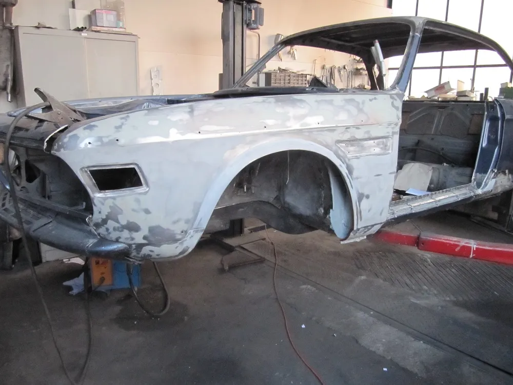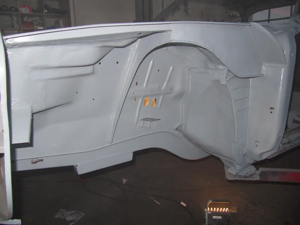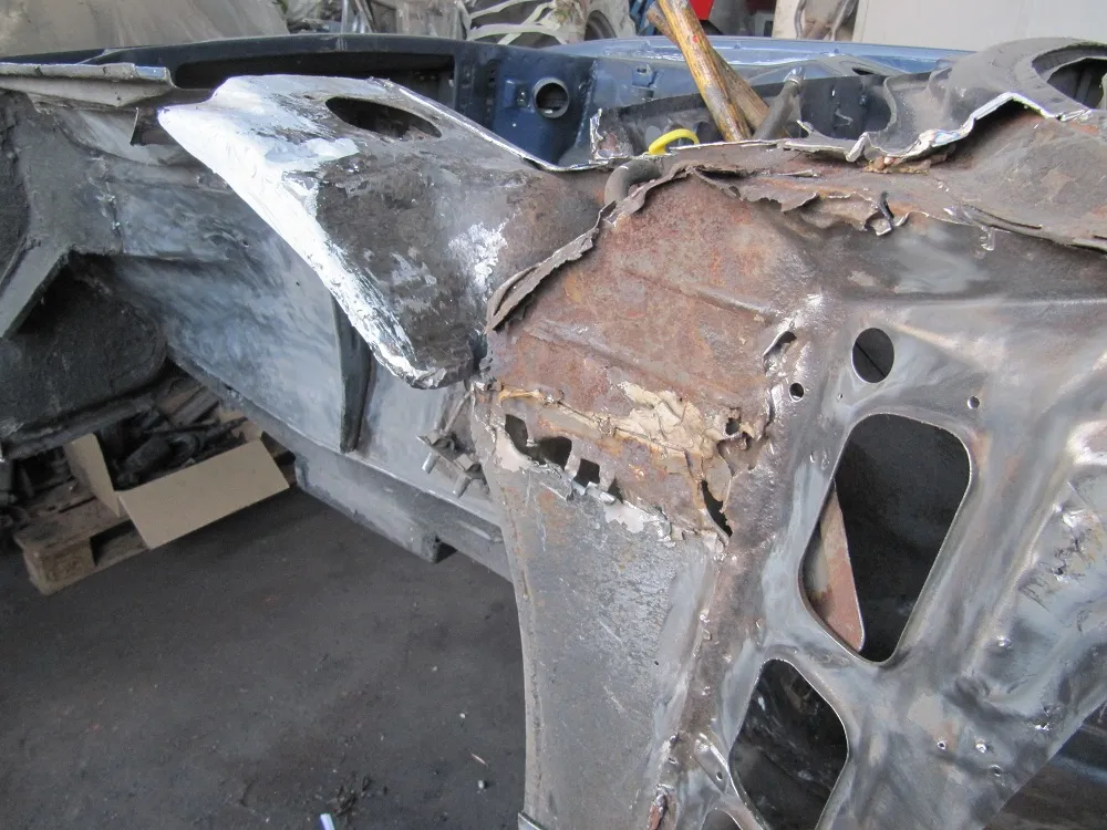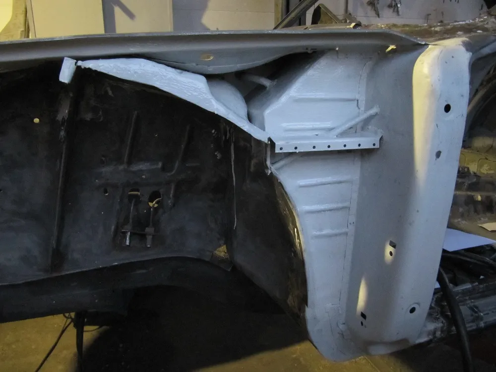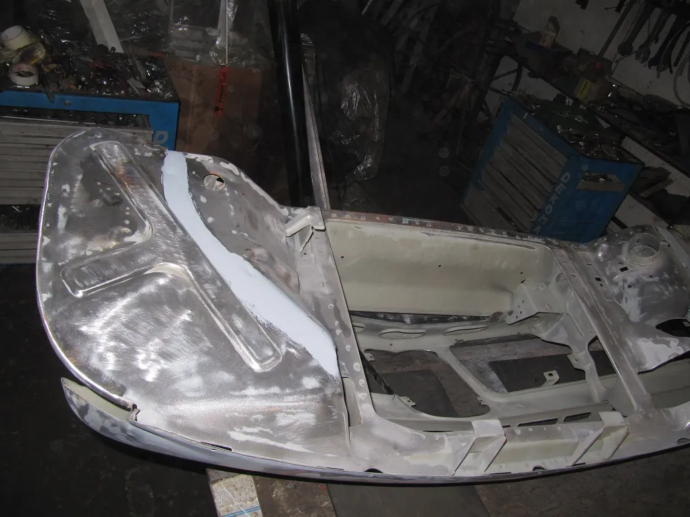 Parallel zu den ganzen Aufhübschungen für den eigentlich geplanten TÜV - Termin hab' ich dazu das ein oder andere Blechteil schon einmal aufbereitet. So hatte ich vor der Stilllegung schon ein paar Teile aus 2 Schlachtern eingelagert. Vordere Kotflügel und die komplette Frontmaske kamen in den OP. Die waren recht neuwertig, da kurz zuvor zusammen mit komletten A-Säulen in den Schlachter kamen. Also Kotflügel entlacken, ein paar Beulen entfernen, 2fach innen grundieren und schon mal mit Unterbodenschutz versehen. Die Frontmaske ist erst einmal nur entlackt.