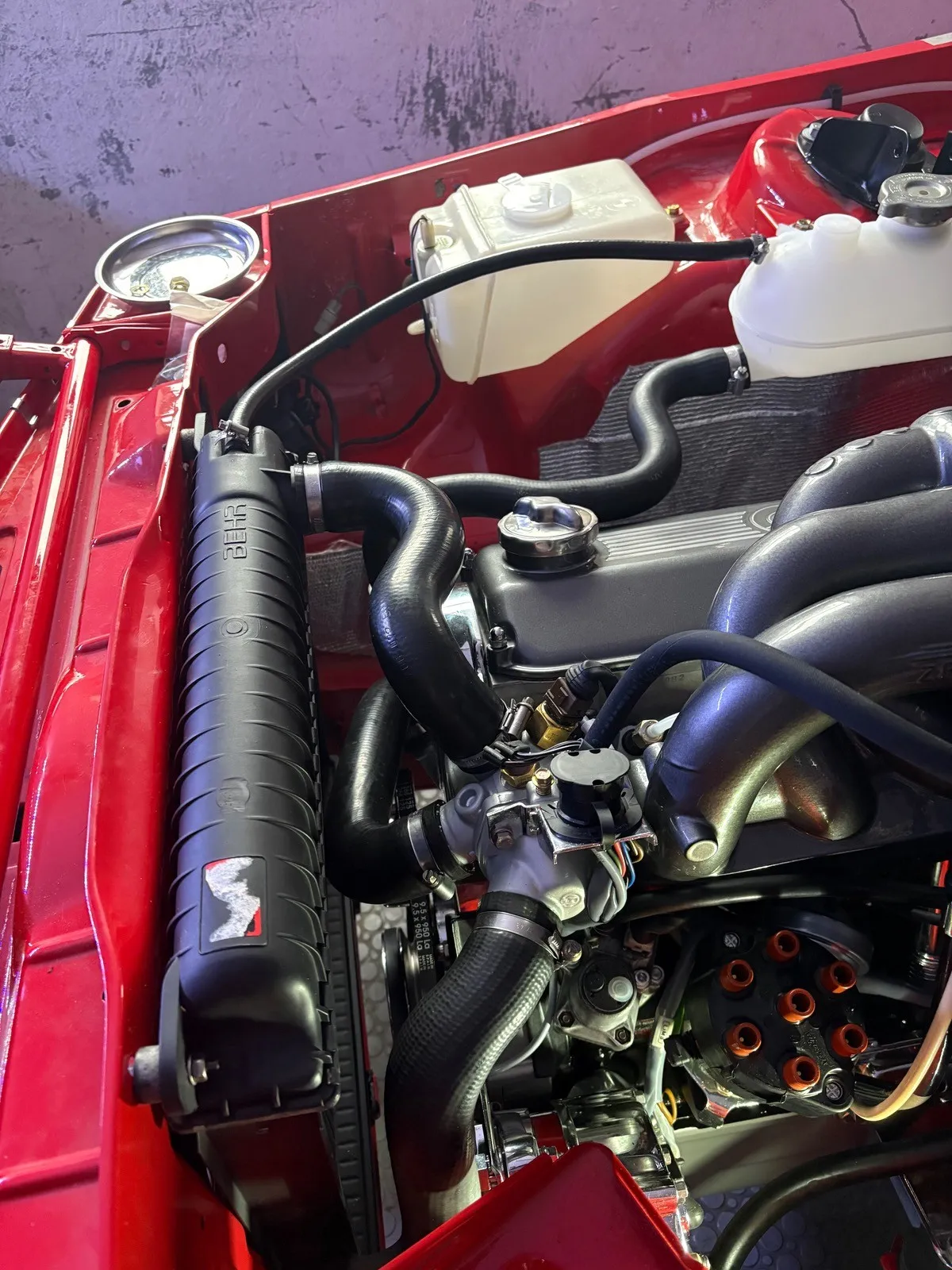 Als Nächstes habe ich mich um die Kühlung gekümmert, jetzt wo der Motor stabil im Fahrzeug sitzt. Zum Glück waren alle Schläuche beschriftet, sodass das verbauen mit ein bisschen rätseln auch kein Problem war. Bis auf den 91 und 99 Grad Stecker, die ich bisher noch nicht gefunden habe, ist der Kühlkreislauf auch vollständig verbaut.