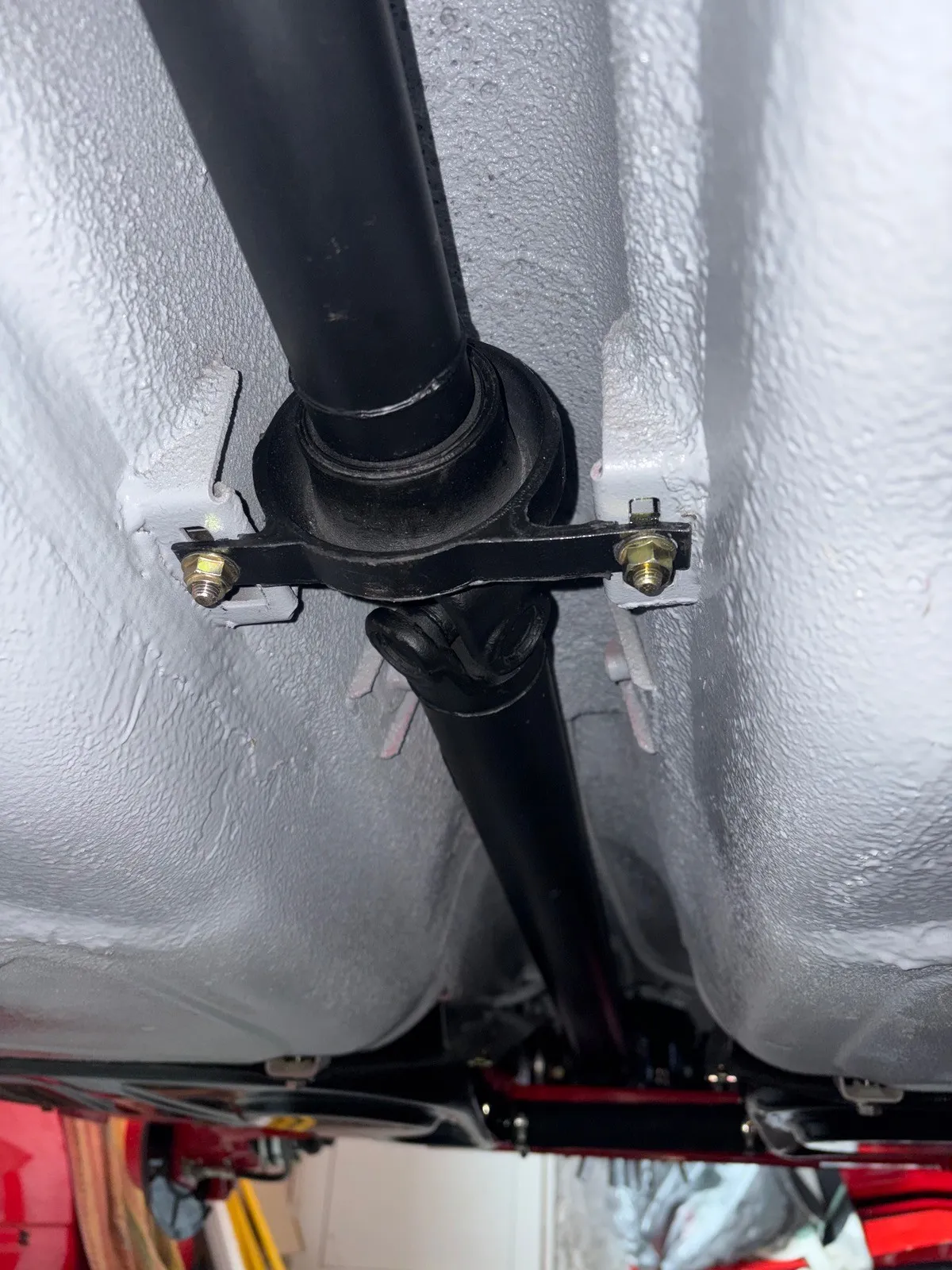Mittlerweile sind das Getriebe, die Schaltung und die Kardanwelle komplett und somit fast alle Teile am Unterboden eingebaut.