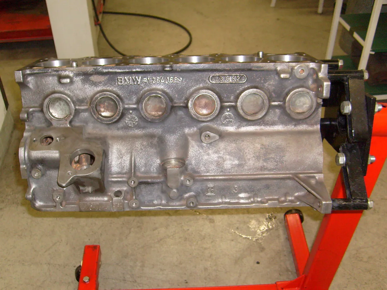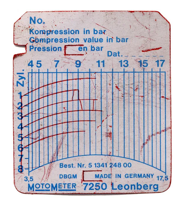 Da lag er nun vor mir, der ALPINA C1-Motor mit der BMW Motor-Nr. 7797307, bzw. der 3762 von ALPINA. Die Recherche ergab, dass er im Juni 1981 produziert wurde. Ein Kompressionsdiagramm hatte Bernd seinerzeit erstellt, bevor er den Zylinderkopf zwecks leichterem Transport vom Rumpf getrennt hatte. Ein guter Anfang – denn laut Diagramm sind die knapp 110 tsd Kilometer ohne große Spuren an ihm vorüber gegangen: